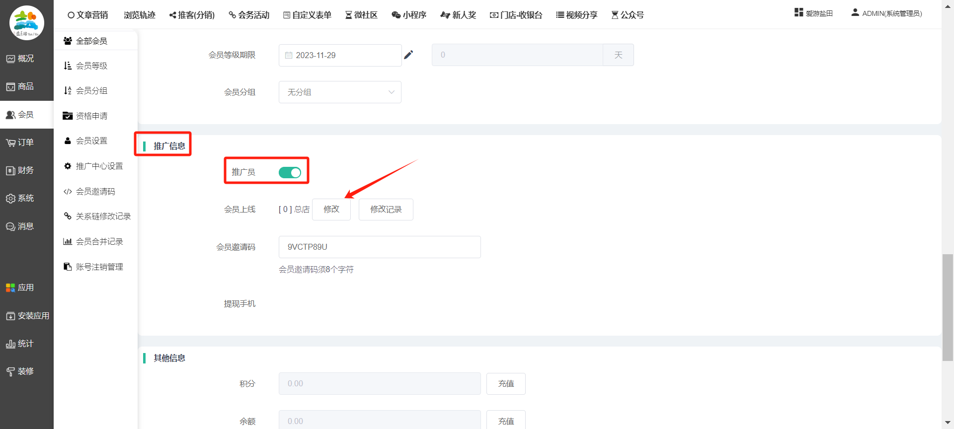 目录 搜索 展开 一、前期准备资料二、数字乡村码-上线操作指南1、服务号的申请流程及认证2、申请小程序流程3、开放平台绑定小程序和公众号三、数字乡村码-系统操作数字乡村码系统管理-概况数字乡村码-商品管理1、发布商品2、商品列表3、商品表单4、商品分类5、品牌管理6、配送模板7、评论管理8、优惠券管理9、商品标签10、退货地址设置11、满额优惠12、批量操作13、配送方式14、基础设置15、商品隐藏四、数字乡村码-会员管理1、全部会员2、会员等级3、会员分组4、资格申请5、会员设置6、推广中心设置7、会员邀请码8、会员关系链修改关系链修改记录9、会员合并记录10、账号注销管理11、会员设置中心五、数字乡村码-订单管理1、订单管理列表2、订单处理流程3、订单状态4、订单修改价格5、订单退款退货6、多包裹发货7、批量发货订单操作步骤8、催发货订单9、物流查询六、数字乡村码-财务管理1、余额设置2、会员余额3、充值记录4、转让记录5、余额明细6、收入明细7、提现设置8、提现统计9、积分管理10、转账审核11、收益广告12、批量充值七、数字乡村码-系统管理1、商城入口2、商城设置①、商城设置②、订单设置③、物流查询④、短信⑤、联系方式⑥、分类⑦、优惠券⑧、分享⑨、幻灯片⑩、广告位⑫、地图设置3、交易设置4、微信模板消息自定义消息模板(新版)自定义消息模板(旧版)小程序消息模板公众号模板消息变更公告5、语言设置6、权限管理7、多媒体管理八、数字乡村码-消息管理九、数字乡村码-应用管理十、数字乡村码系统-数据统计十一、数字乡村码-页面装修DIY1、模板管理2、店铺页面3、顶部导航4、底部导航5、DIY模板市场6、首屏广告7、基础设置8、装修DIY尺寸建议十二、供应商功能插件操作指南1、供应商2、门店-收银台门店申请和使用步骤门店管理①、门店-收银台 营销设置②、门店-收银台 分润设置门店分类门店申请门店审核门店商品门店商品订单收银台订单数据统计核销员基础设置默认设置门店装修3、微社区4、会务活动十三、营销插件操作指南活动报名提货卡新人奖微店问卷调查积分视频分享1、视频分享基础设置2、视频分享发现管理3、视频分享分类管理4、视频分享评论管理5、视频分享分红记录6、视频分享短视频中心每日红包幸运大抽奖签到优惠券二维码任务奖励优惠劵文章音频文章付费文章限时购新海报拓客卡操作流程积分活动素材中心视频红包十四、入驻门店应用类1、门店预约2、附近商品3、门店定位设置4、门店控制5、门店满额包邮6、门店满额减7、导入商品8、门店搜索9、门店股东10、核销券11、多门店核销1、商城后台设置2、前端功能演示十五、常见问题1、后台登录密码修改流程2、会员-余额,积分,后台如何进行充值与扣除3、如何修改上下级关系4、一种万能的获取商城小程序路径的方法 暂无相关搜索结果! 阅读次数:1610 本文档使用 模王系统 发布 8、会员关系链修改 8、会员关系链修改一.如何修改上下级关系?1.会员-全部会员-可以通过搜索用户的独立ID,或者用户微信昵称,找到此会员,然后点击右边的(操作)2.再点击会员详情。3.滑到下面,有个推广信息-会员上线,点击修改4.输入上级的ID号,点击搜索,出来此上级会员后点击选择。5.滑到最下面,一定要点击提交按钮。文档更新时间: 2023-11-30 14:56 作者:链上旅行