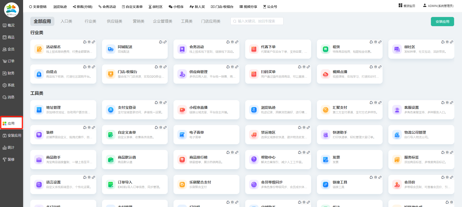 目录 搜索 展开 一、前期准备资料二、数字乡村码-上线操作指南1、服务号的申请流程及认证2、申请小程序流程3、开放平台绑定小程序和公众号三、数字乡村码-系统操作数字乡村码系统管理-概况数字乡村码-商品管理1、发布商品2、商品列表3、商品表单4、商品分类5、品牌管理6、配送模板7、评论管理8、优惠券管理9、商品标签10、退货地址设置11、满额优惠12、批量操作13、配送方式14、基础设置15、商品隐藏四、数字乡村码-会员管理1、全部会员2、会员等级3、会员分组4、资格申请5、会员设置6、推广中心设置7、会员邀请码8、会员关系链修改关系链修改记录9、会员合并记录10、账号注销管理11、会员设置中心五、数字乡村码-订单管理1、订单管理列表2、订单处理流程3、订单状态4、订单修改价格5、订单退款退货6、多包裹发货7、批量发货订单操作步骤8、催发货订单9、物流查询六、数字乡村码-财务管理1、余额设置2、会员余额3、充值记录4、转让记录5、余额明细6、收入明细7、提现设置8、提现统计9、积分管理10、转账审核11、收益广告12、批量充值七、数字乡村码-系统管理1、商城入口2、商城设置①、商城设置②、订单设置③、物流查询④、短信⑤、联系方式⑥、分类⑦、优惠券⑧、分享⑨、幻灯片⑩、广告位⑫、地图设置3、交易设置4、微信模板消息自定义消息模板(新版)自定义消息模板(旧版)小程序消息模板公众号模板消息变更公告5、语言设置6、权限管理7、多媒体管理八、数字乡村码-消息管理九、数字乡村码-应用管理十、数字乡村码系统-数据统计十一、数字乡村码-页面装修DIY1、模板管理2、店铺页面3、顶部导航4、底部导航5、DIY模板市场6、首屏广告7、基础设置8、装修DIY尺寸建议十二、供应商功能插件操作指南1、供应商2、门店-收银台门店申请和使用步骤门店管理①、门店-收银台 营销设置②、门店-收银台 分润设置门店分类门店申请门店审核门店商品门店商品订单收银台订单数据统计核销员基础设置默认设置门店装修3、微社区4、会务活动十三、营销插件操作指南活动报名提货卡新人奖微店问卷调查积分视频分享1、视频分享基础设置2、视频分享发现管理3、视频分享分类管理4、视频分享评论管理5、视频分享分红记录6、视频分享短视频中心每日红包幸运大抽奖签到优惠券二维码任务奖励优惠劵文章音频文章付费文章限时购新海报拓客卡操作流程积分活动素材中心视频红包十四、入驻门店应用类1、门店预约2、附近商品3、门店定位设置4、门店控制5、门店满额包邮6、门店满额减7、导入商品8、门店搜索9、门店股东10、核销券11、多门店核销1、商城后台设置2、前端功能演示十五、常见问题1、后台登录密码修改流程2、会员-余额,积分,后台如何进行充值与扣除3、如何修改上下级关系4、一种万能的获取商城小程序路径的方法 暂无相关搜索结果! 阅读次数:1473 本文档使用 模王系统 发布 九、数字乡村码-应用管理 九、商城管理-应用显示所有商城已安装并启用的应用,包含以下大类:具体根据自家商城后台系统显示为准。每个应用功能设置步骤较多,请查看相对应应用的学习文档。文档更新时间: 2024-01-08 10:36 作者:链上旅行