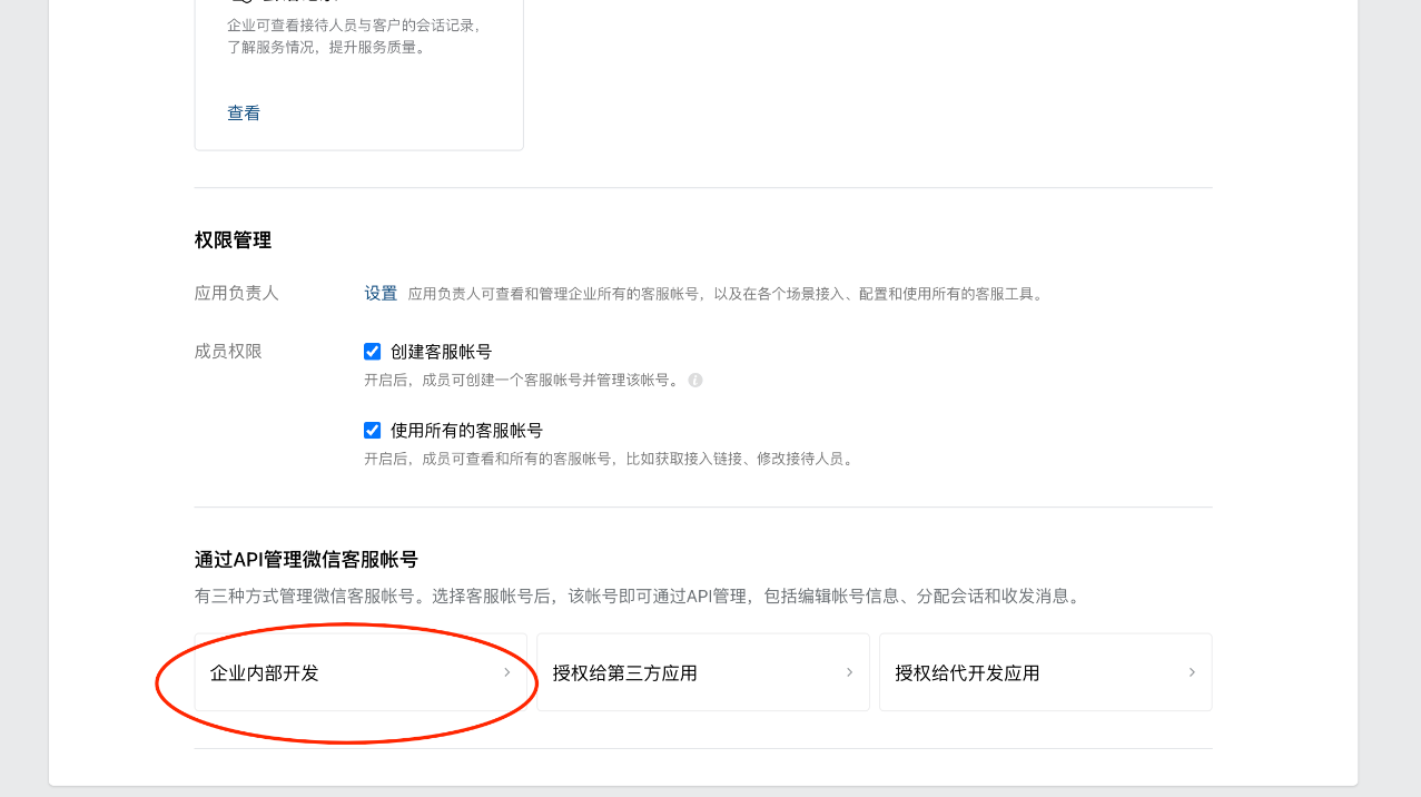 在企业微信管理后台(官方)--应用管理--微信客服中,拉到最后,找到通过API管理微信客服账号--企业内部开发,进行客服账号授权