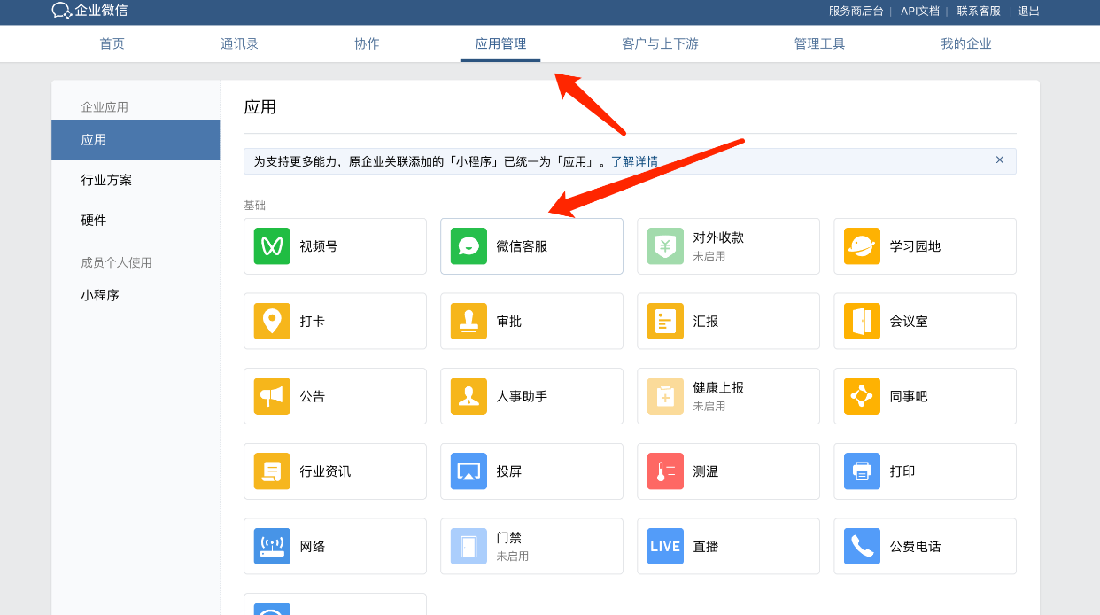 1、进入企业微信管理平台(官方)--应用管理--微信客服
