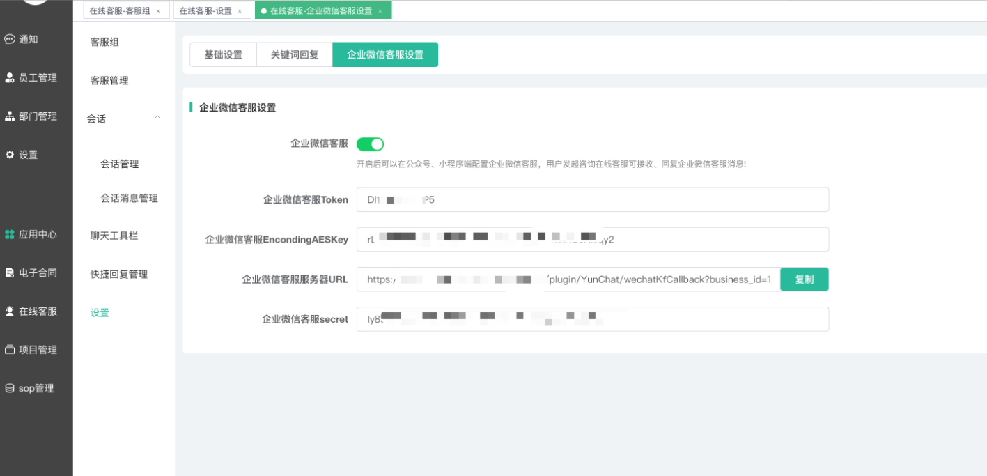 获取Secret填入企业管理PC端--在线客服--基础设置--企业微信设置中;